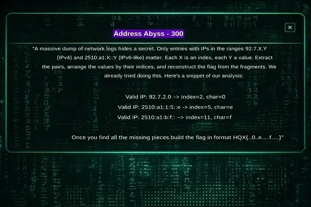 8. Address Abyss - HQX{e1f63411d0d0ad58a87b08bb0860d9f4}
